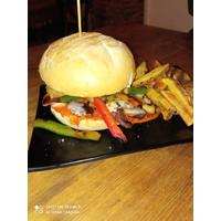 Polpo arrostito, crema ortolana, peperoni grigliati e cipolla tropeana in tempura, serviti con contorno di patatine fritte