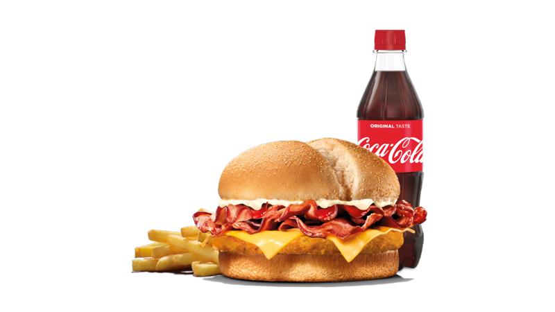 Menù composto da panino Chicken Bacon King (petto di pollo croccante in un morbido panino al mais, 8 fette di bacon, formaggio cheddar, ketchup, maionese), porzione di patatine fritte e bibita a sceltra tra: acqua, coca cola, coca cola zero, coca cola lemon zero, fanta, sprite, fuze tea limone, fuze tea pesca, pago arancia.