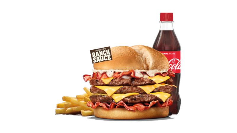 Menù composto da panino Bacon king 3.0 Ranch (DA VERI KING! Triplo strato di carne e formaggio con 8 fette di bacon ed il gusto piccante della salsa ranch con grani di pepe nero.), porzione di patatine fritte e bibita a sceltra tra: acqua, coca cola, coca cola zero, coca cola lemon zero, fanta, sprite, fuze tea limone, fuze tea pesca, pago arancia.
