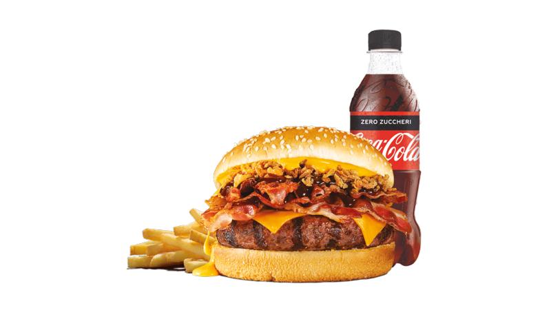 Menù composto da panino CRAZY CHEESE BBQ (Cheddar, bacon, cipolla croccante, gustosa salsa cheddar e l'originale salsa BBQ Bull's Eye. Crazy Cheese BBQ. Si salsi chi può!), porzione di patatine fritte e bibita a sceltra tra: acqua, coca cola, coca cola zero, coca cola lemon zero, fanta, sprite, fuze tea limone, fuze tea pesca, pago arancia.