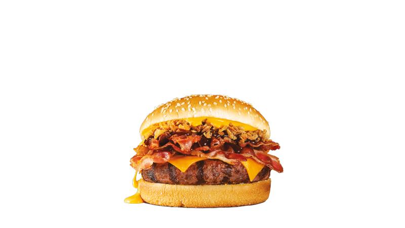 Menù composto da panino Bacon King (due hamburger di manzo alla griglia con 8 fette di bacon, cheddar, ketchup e maionese), porzione di patatine fritte e bibita a sceltra tra: acqua, coca cola, coca cola zero, coca cola lemon zero, fanta, sprite, fuze tea limone, fuze tea pesca, pago arancia.
