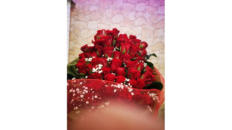 Con Rose, girasoli, lilium casablanca, gipsofilia, verde vario