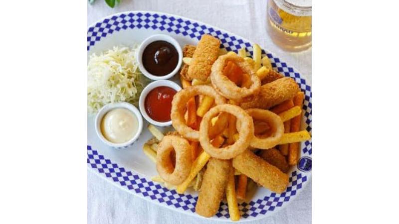 (Consigliato per 2/3 persone) 4 bastoncini di formaggio e verdure*, 4 crocchette di pollo*, 5 anelli di cipolla*, polentine aromatiche* e patatine fritte*, servite con insalata di cavolo, maionese, ketchup e salsa BBQ