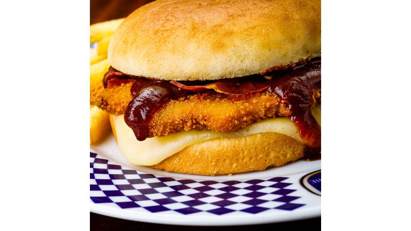 Pane, cotoletta di pollo fritta, speck croccante, formaggio e salsa BBQ