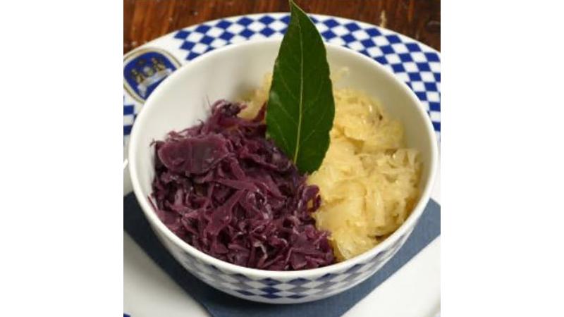 Un Bavarianwürst a base di carne di maiale e manzo, un Würstel al formaggio avvolto nella pancetta, una salsiccia contadina e una salsiccia di Norimberga IGP* alla griglia, serviti con patatine fritte*, insalata di cavolo e senape