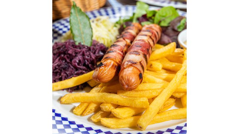 Pane, bastoncini di formaggio e verdure, crauti rossi, insalata e senape dolce.