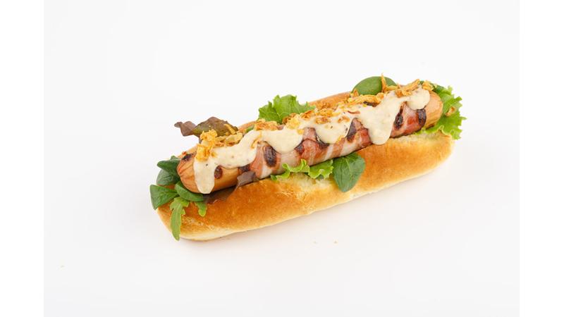 Pane, Würstel a base di carne di maiale ripieno di formaggio e avvolto nella pancetta, insalata misticanza cipolla croccante, salsa Lowengrube