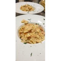 Farfalle preparate con un sugo di pomodori locali al quale è stato aggiunto un po di panna per rendere il tutto più cremoso al palato. L'aggiunta in un secondo momento della cipolla di Tropea e del tonno affumicato fa mantenere il gusto di ogni singolo ingrediente fino in fondo.