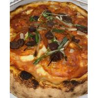 Pomodoro San Marzano, Mozzarella, Salame Piccante, Olive, Cipolletta, Olio
